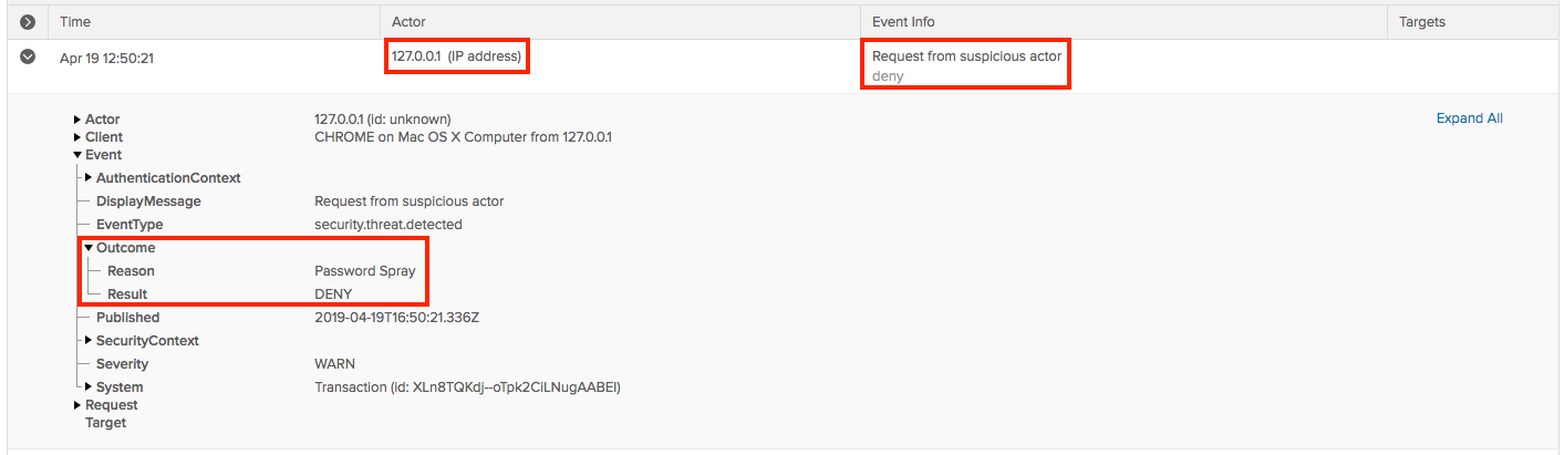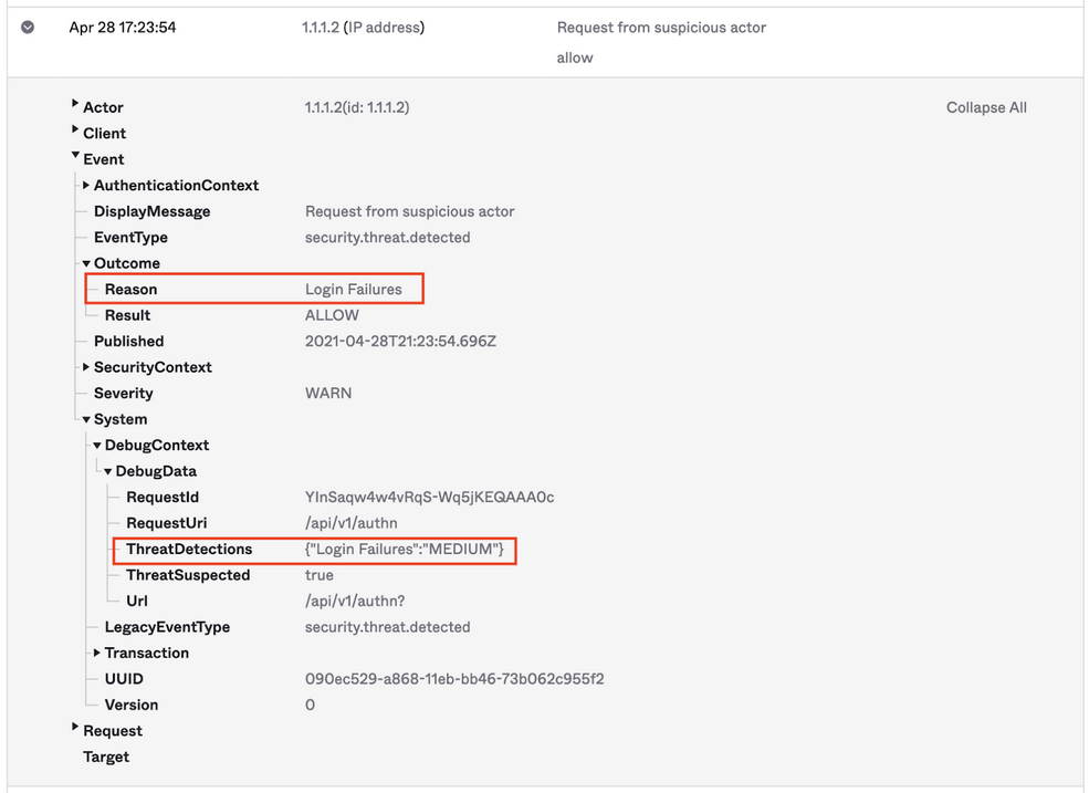 Okta ThreatInsight records requests from potentially malicious IP addresses in the System Log. It records the following types of events:
